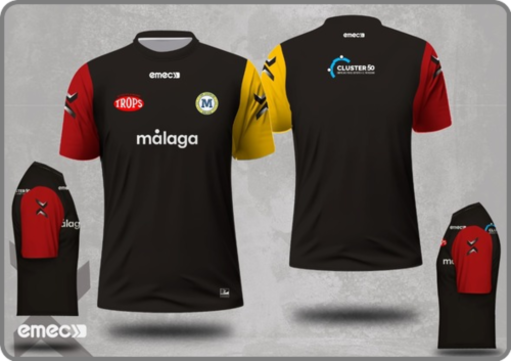 Camiseta del equipo técnico del Trops Málaga, de la temporada 2024-2025. En color negro, con mangas rojas y amarillas, está fabricada por la firma Emec en un tejido cien por cien poliéster, a las que se les ha aplicado un acabado de última generación y con alta capacidad de transpiración.